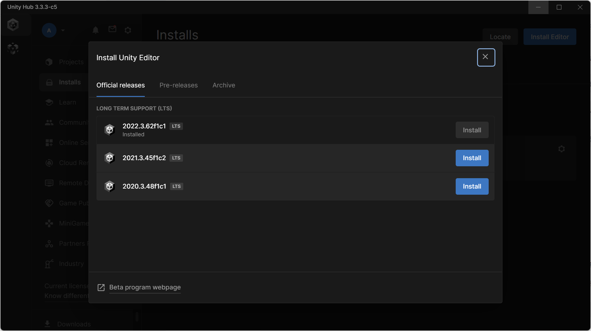 市面上可以开发3D游戏的引擎有许多,例如UE5、unity、Armory3D等等很多很多,而unity是比较容易上手的,而且教程不输于其他的开发引擎,我们选定的开发环境为:Unity 2022.3.62f1c1版本,如果你是初学者想一步一步学习基础,可以安装最新稳定版,我们平常学习使用的unity是有开屏动画的,如果想要取消,那么就需要进入公司或者大厂开发,获取unity定制版。