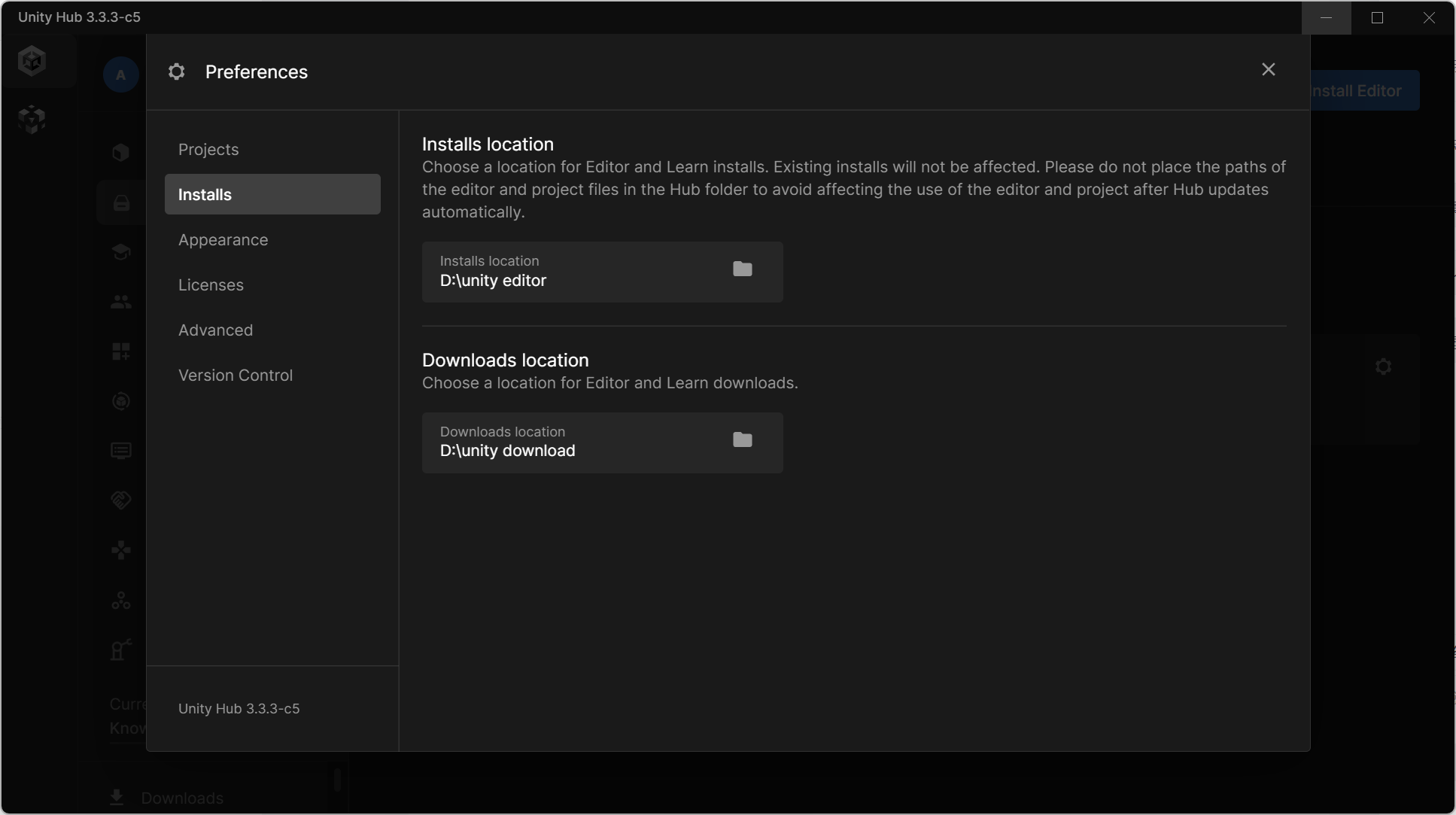 先进入Unity Hub 打开设置(preference)->安装(installs)改变安装位置