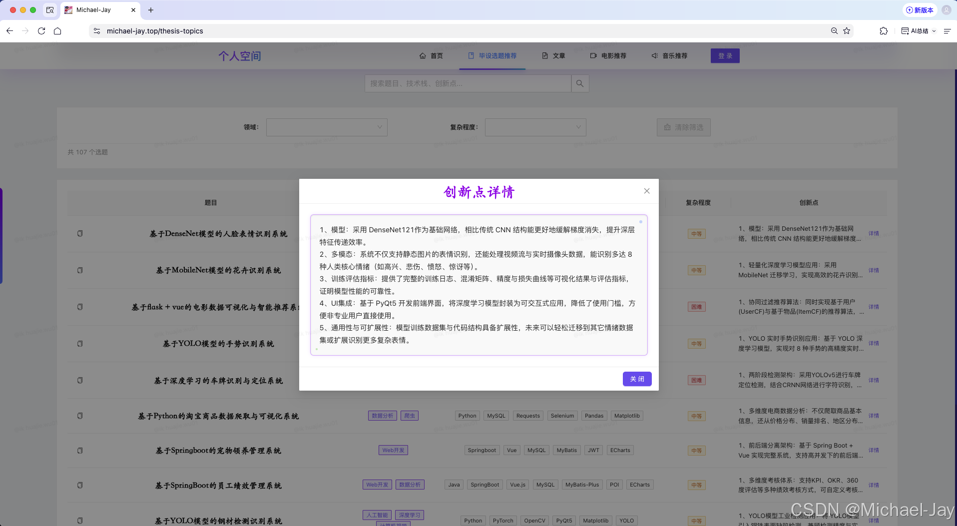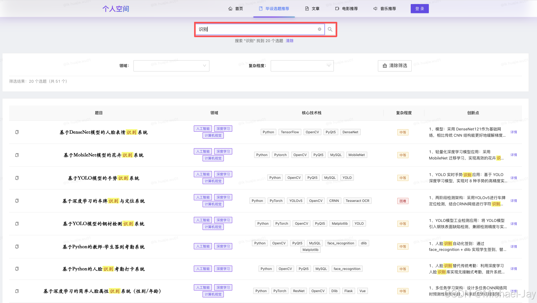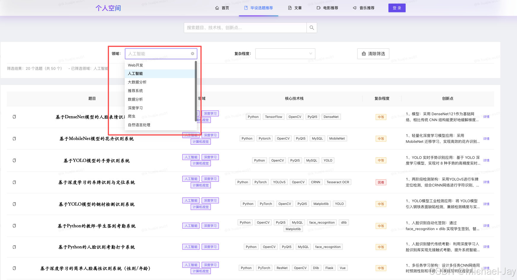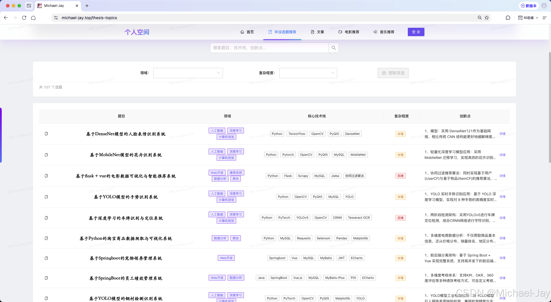 这几天给个人网站加了个毕设选题推荐,目前有100+条选题,涵盖人工智能、深度学习(NLP、CV)、web开发、大数据分析、爬虫、推荐系统等领域。每个选题都有对应的核心技术栈、选题复杂度、创新点。