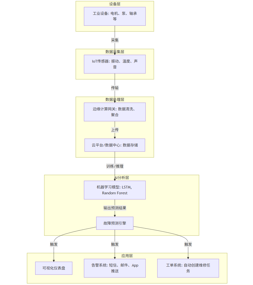 AI解决方案: 在设备上安装大量传感器(振动、温度、声音、电流等),实时收集设备运行数据。利用机器学习模型(如LSTM、随机森林)分析这些时间序列数据,学习设备从正常到故障前的微妙变化模式,从而提前数天甚至数周预测到潜在的故障,并发出预警。