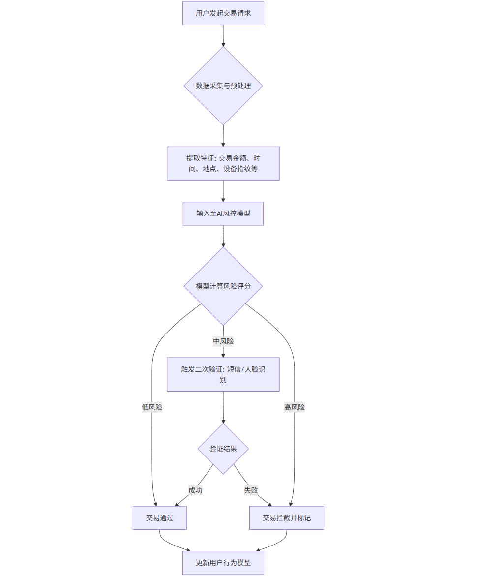 AI解决方案: 利用机器学习模型,特别是梯度提升决策树和深度学习网络,对用户的历史交易行为、设备信息、地理位置、操作习惯等上百个维度进行实时分析。模型能够学习到正常行为的“基线”,并精准识别出偏离基线的异常模式,从而在欺诈行为发生前进行预警和拦截。