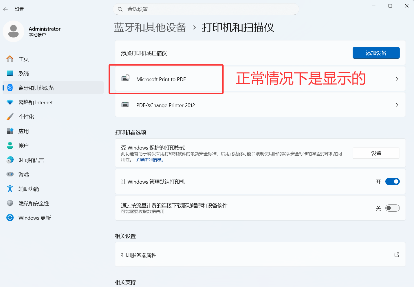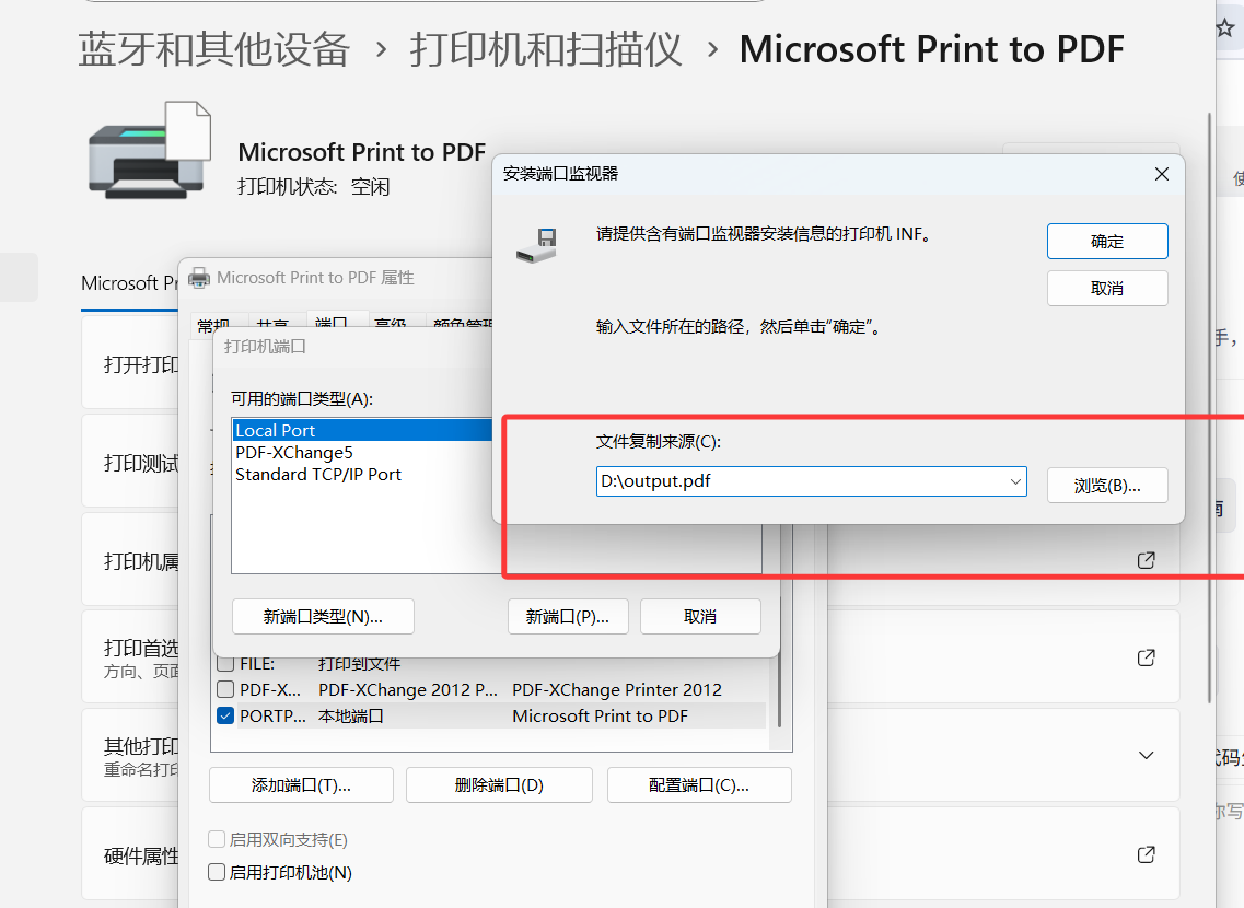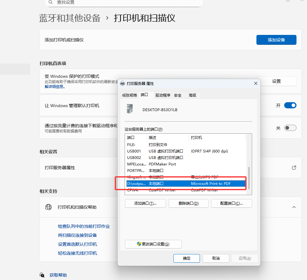 关于win11的Microsoft To Pdf打印机修改端口后无法再刷新显示于设备界面的问题