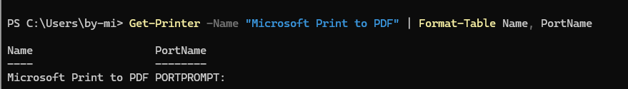Get-Printer -Name "Microsoft Print to PDF" | Format-Table Name, PortName