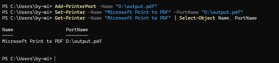 Set-Printer -Name "Microsoft Print to PDF" -PortName "D:\output.pdf"