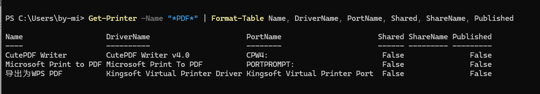 Get-Printer -Name "*PDF*" | Format-Table Name, DriverName, PortName, Shared, ShareName, Published