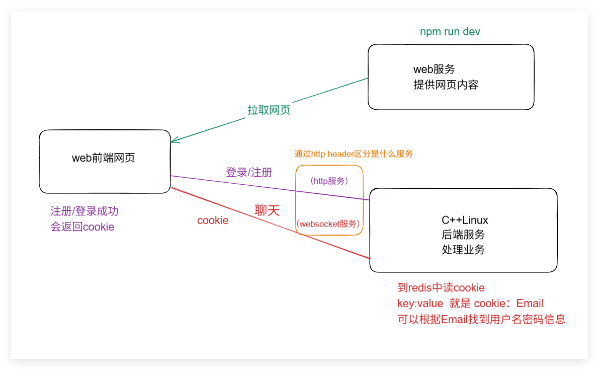 用户A注册账号,建立http服务,解析json数据,验证信息在数据库不存在且存入redis后,给用户A返回一个cookie,限时一天,用户A可以拿着cookie与服务器发送消息,期间无需再验证密码。登录成功后,用户A给服务器发送握手信息,请求Websocket服务,建立连接。服务端在检验cookie有效后,把用户A的ID和连接建立map映射,并且给其订阅默认的五个聊天室,随后加载五个聊天室的历史数据返回给用户A,尽管没有数据。用户A收到数据,知道连接建立成功。随后用户A在1号聊天室发布一条消息,服务器收到A通过websocket发来的websocket数据帧,按照websocket格式解析出frame,再通过json反序列化获取payload_data,把这个data存入redis数据库后,消息就算是落盘了,再执行一遍相反的包装操作,把这个websocket数据帧发送给其余也订阅了1号聊天室的用户,尽管这时候只有用户A。