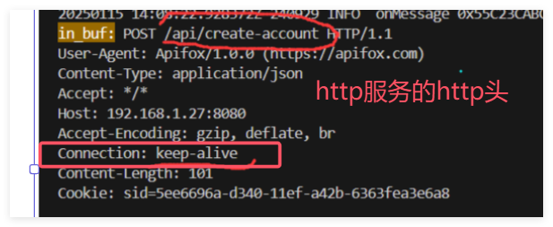 {const char *in_buf = buf->peek();int32_t len = buf->readableBytes();http_parser_.ParseHttpContent(in_buf, len);if(http_parser_.IsReadAll()) {string url = http_parser_.GetUrlString();string content = http_parser_.GetBodyContentString();LOG_INFO << "url: " << url << ", content: " << content; if (strncmp(url.c_str(), "/api/login", 10) == 0) { // 登录_HandleLoginRequest(url, content);} else if(strncmp(url.c_str(), "/api/create-account", 18) == 0) { // 注册_HandleRegisterRequest(url, content);} else {//处理未匹配的URLchar *resp_content = new char[256];string str_json = "{\"code\": 1}"; uint32_t len_json = str_json.size();//暂时先放这里#define HTTP_RESPONSE_REQ \"HTTP/1.1 404 OK\r\n" \"Connection:close\r\n" \"Content-Length:%d\r\n" \"Content-Type:application/json;charset=utf-8\r\n\r\n%s"snprintf(resp_content, 256, HTTP_RESPONSE_REQ, len_json, str_json.c_str()); tcp_conn_->send(resp_content);}}}