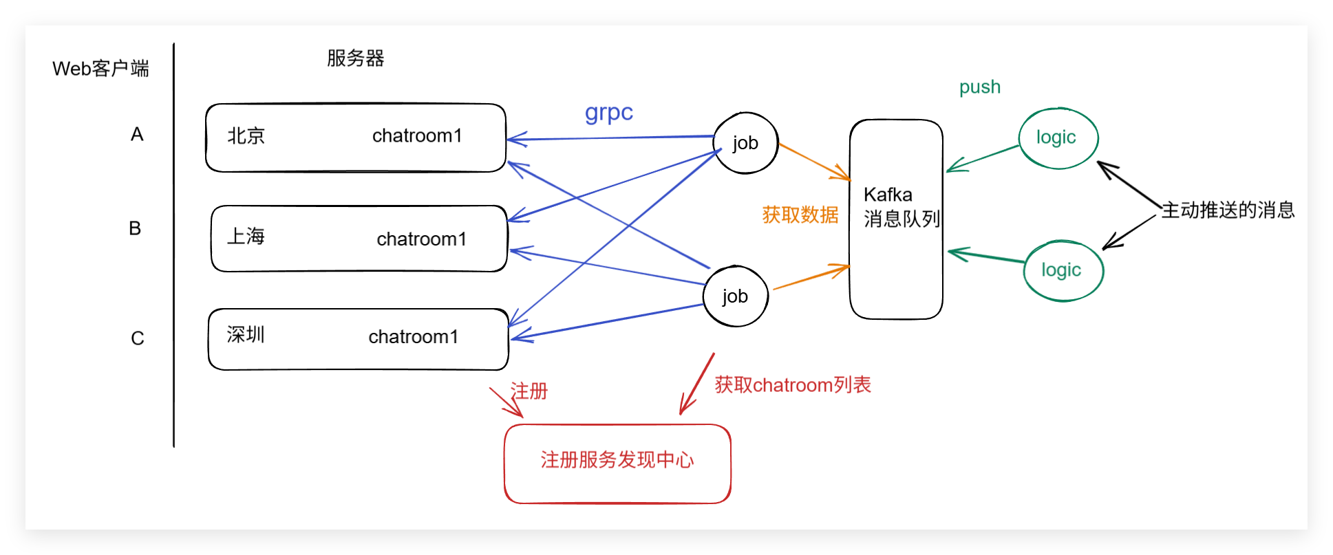 首先所有服务器上有聊天室注册上线的时候,都应该在一个"注册服务发现中心"注册自己的信息,比如来自于哪一台服务器,由 "job"服务从注册服务发现中心里面拉取chatroom列表,发起连接,由"grpc"推送消息到chatroom,然后再推送到web客户端。