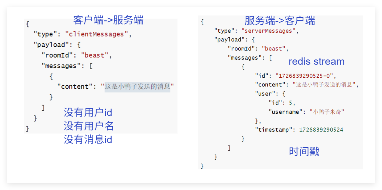 到Redis获取房间的消息,存入message_batch结构中ApiGetRoomHistory(room_item, message_batch); LOG_INFO << "room: " << room_item.room_name << ", history_last_message_id:" << it->second.history_last_message_id;Json::Value room; room["id"] = room_item.room_id; //聊天室主题名称room["name"] = room_item.room_name; //聊天室主题名称 先设置成一样的room["hasMoreMessages"] = message_batch.has_more;Json::Value messages; for(int j = 0; j < message_batch.messages.size(); j++) {Json::Value message;Json::Value user;message["id"] = message_batch.messages[j].id;message["content"] = message_batch.messages[j].content; user["id"] = userid_;user["username"] = username_;message["user"] = user;message["timestamp"] = (Json::UInt64)message_batch.messages[j].timestamp;messages[j] = message;}if(message_batch.messages.size() > 0)room["messages"] = messages;else room["messages"] = Json::arrayValue; //不能为NULL,否则前端报异常rooms[it_index] = room;it_index++;}payload["rooms"] = rooms;root["payload"] = payload;Json::FastWriter writer;string str_json = writer.write(root);// 打印 JSON 字符串LOG_INFO << "Serialized JSON: " << str_json;string hello = buildWebSocketFrame(str_json);send(hello);