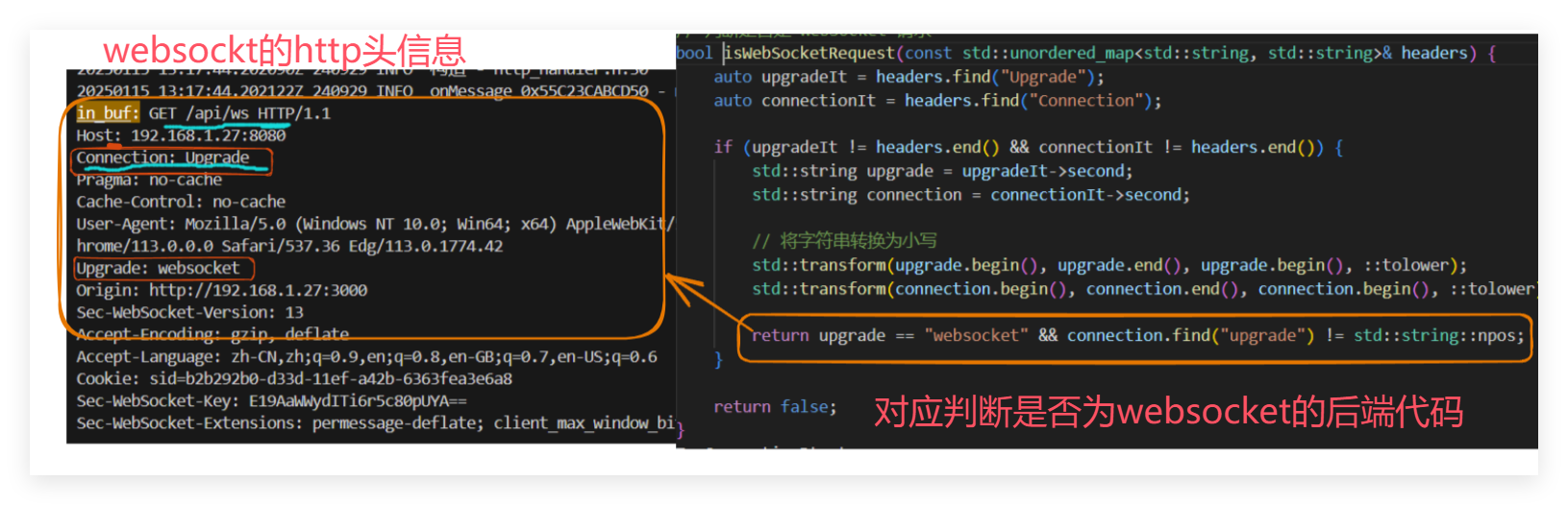 //http_handler.hvoid OnRead(Buffer* buf) {if(request_type_ == UNKNOWN) {const char *in_buf = buf->peek();int32_t len = buf->readableBytes();std::cout << "in_buf: " << in_buf << std::endl;auto headers = parseHttpHeaders(in_buf, len); //解析http头if (isWebSocketRequest(headers)) {// WebSocket 请求request_type_ = WEBSOCKET;http_conn_ = std::make_shared<CWebSocketConn>(tcp_conn_);http_conn_->setHeaders(headers);} else {// HTTP 请求request_type_ = HTTP;http_conn_ = std::make_shared<CHttpConn>(tcp_conn_);http_conn_->setHeaders(headers);}}// 将数据交给具体的处理器if(http_conn_)http_conn_->OnRead(buf);