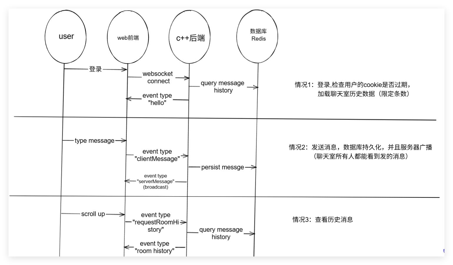 客户端对服务器的主动发送消息,有可能是 "握手信号" ,有可能非握手信号。非握手信号有:"具体消息" 和 "历史消息的查看"