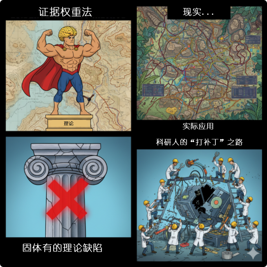 承接上文,证据权重法 (WofE) 自问世以来,虽为成矿预测带来了革命性的进步,但其与生俱来的理论缺陷在复杂的实际应用中成为了无法回避的“阿喀琉斯之踵”。正是为了弥补这些裂痕,无数科研工作者前赴后继,开启了一段漫长而富有挑战的“打补丁”征程。
