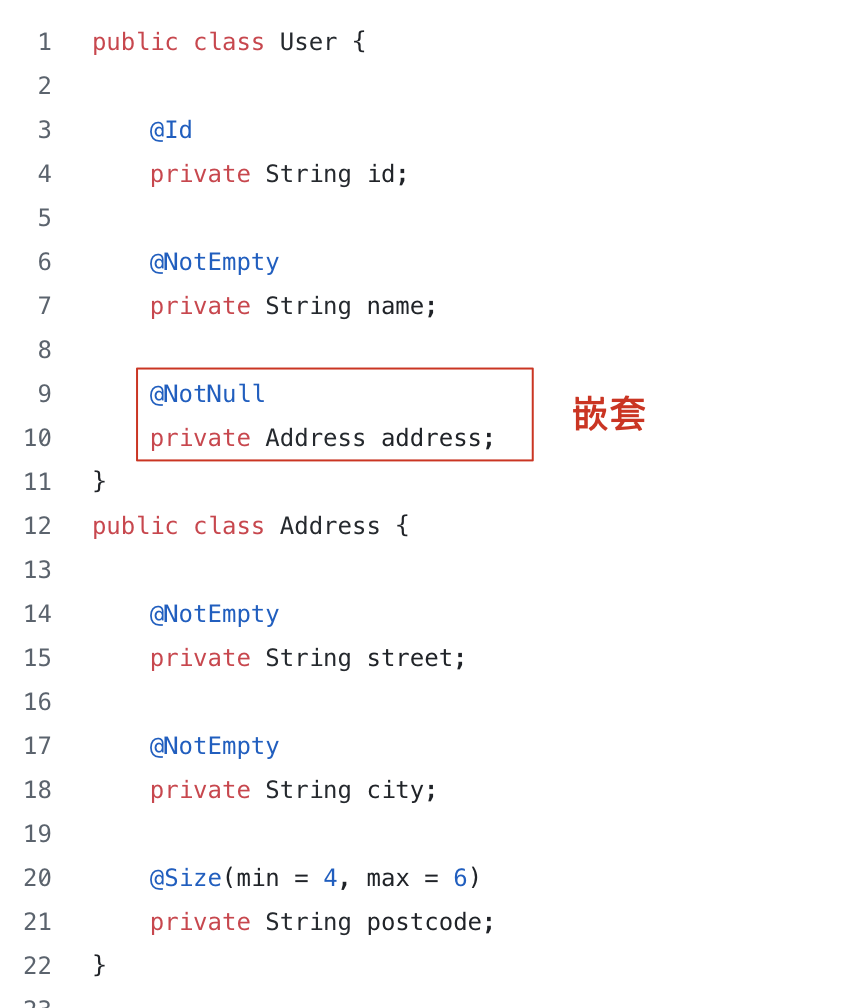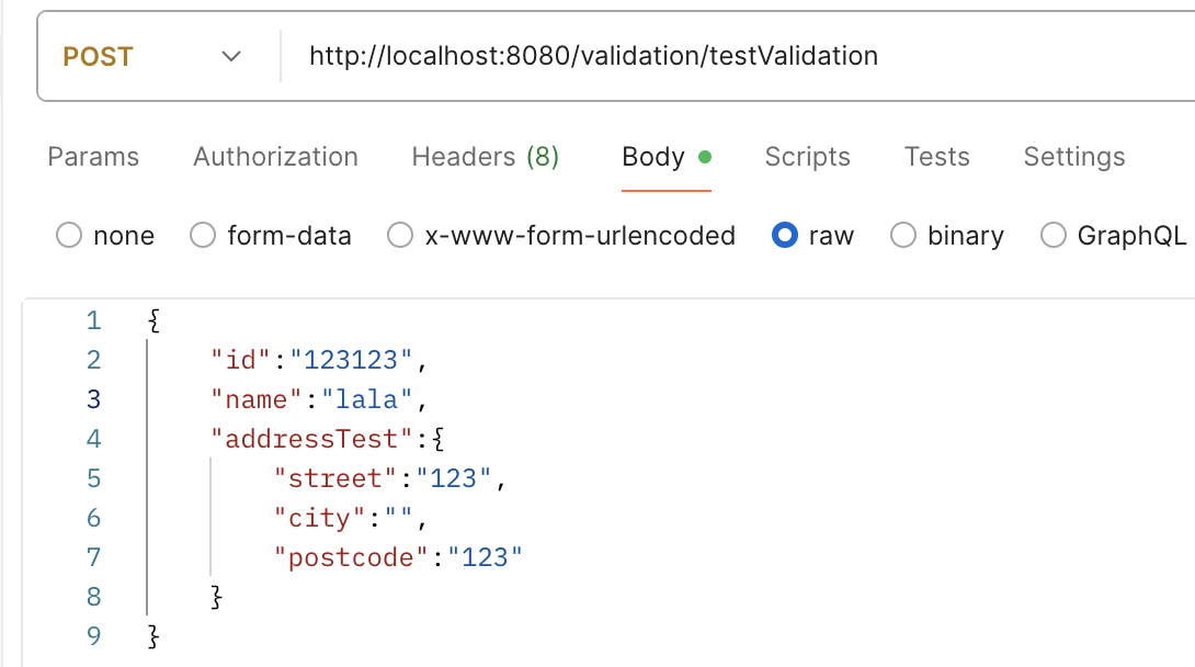 }class AddressDTO {@NotBlank private String city;@NotBlank private String street;