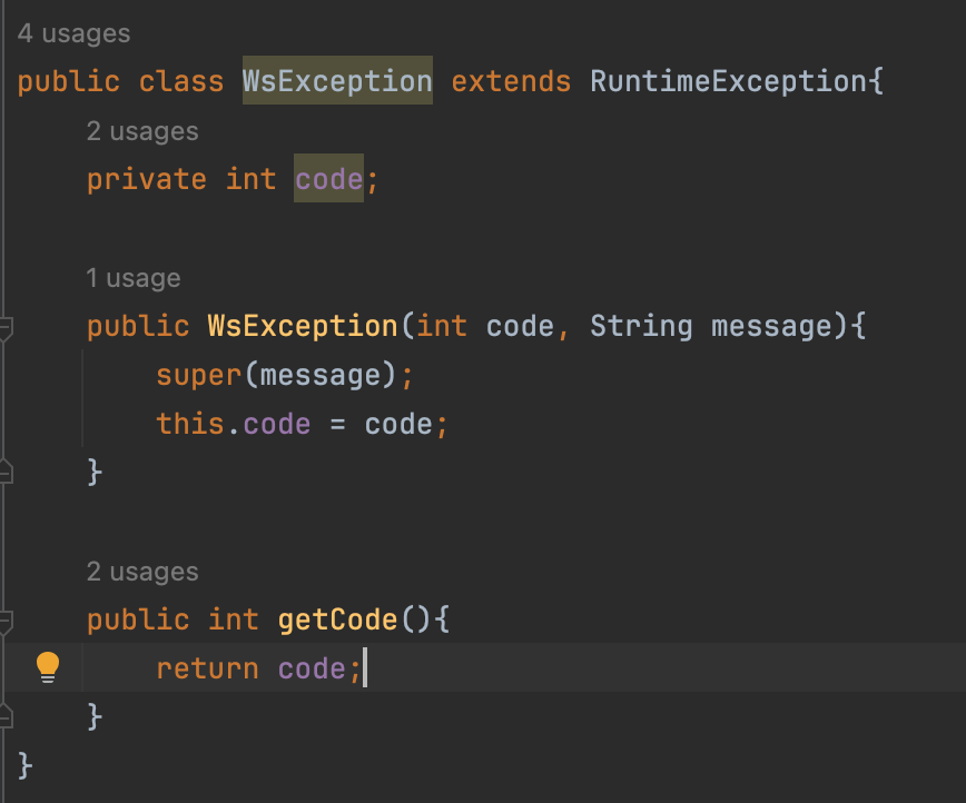 public class BusinessException extends RuntimeException {private int code; // 错误码public BusinessException(int code, String message) {super(message);this.code = code;}public int getCode() {return code;}