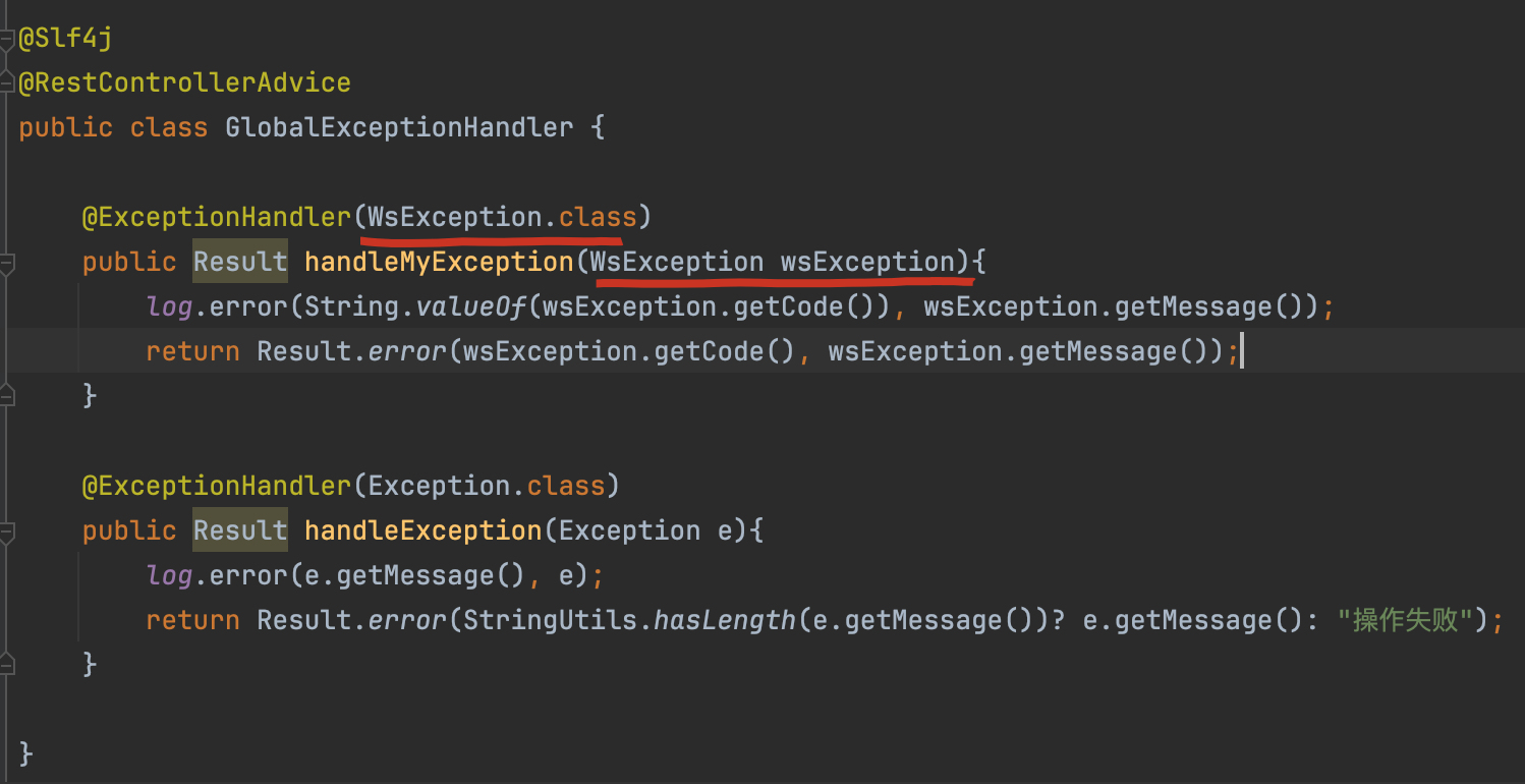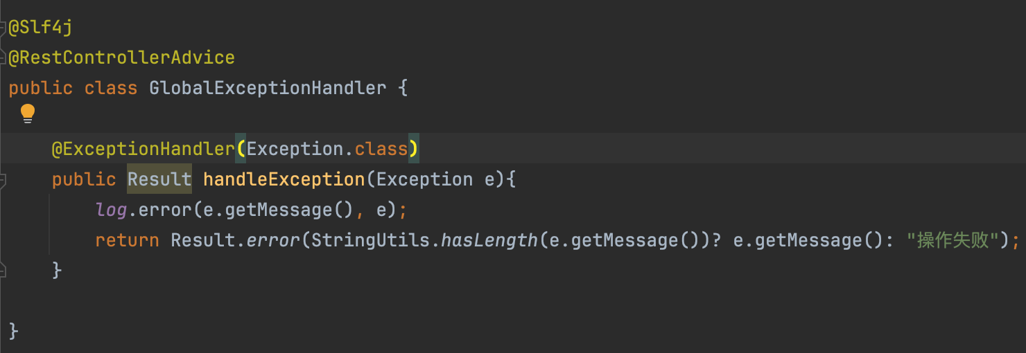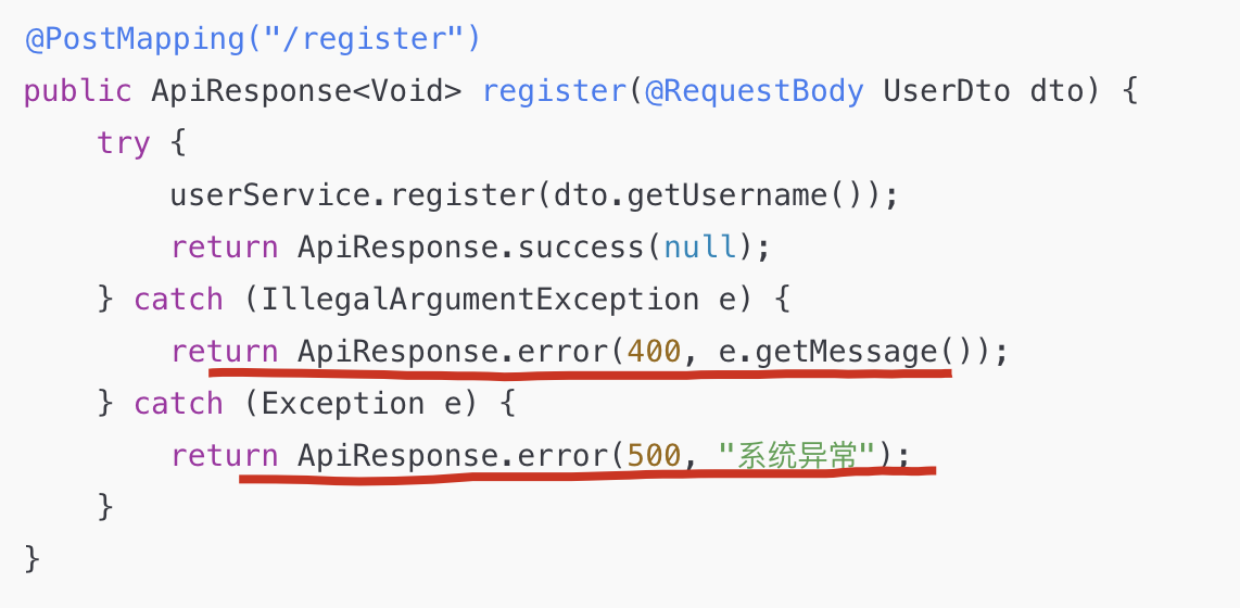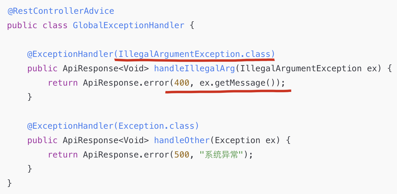 public class GlobalExceptionHandler {@ExceptionHandler(MethodArgumentNotValidException.class)public ApiResponse<Void> handleMethodArgNotValid(MethodArgumentNotValidException ex) {return ApiResponse.error(400, ex.getBindingResult().getFieldError().getDefaultMessage());}@ExceptionHandler(BindException.class)public ApiResponse<Void> handleBindException(BindException ex) {return ApiResponse.error(400, ex.getBindingResult().getFieldError().getDefaultMessage());}@ExceptionHandler(ConstraintViolationException.class)public ApiResponse<Void> handleConstraintViolation(ConstraintViolationException ex) {return ApiResponse.error(400, ex.getMessage());}@ExceptionHandler(Exception.class)public ApiResponse<Void> handleOther(Exception ex) {return ApiResponse.error(500, "系统异常");}