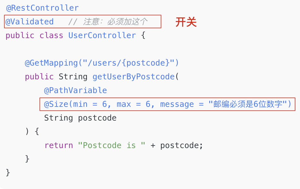 @Validated // 启用方法级与参数级校验(如 PathVariable/RequestParam)