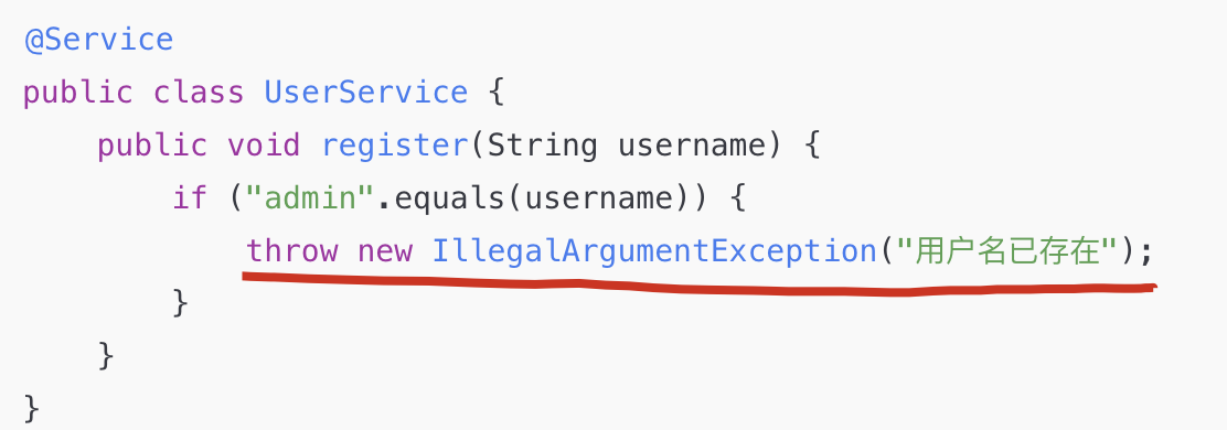 无法区分业务错误(如“用户名已存在”)和系统错误(如空指针、数据库连接失败)。