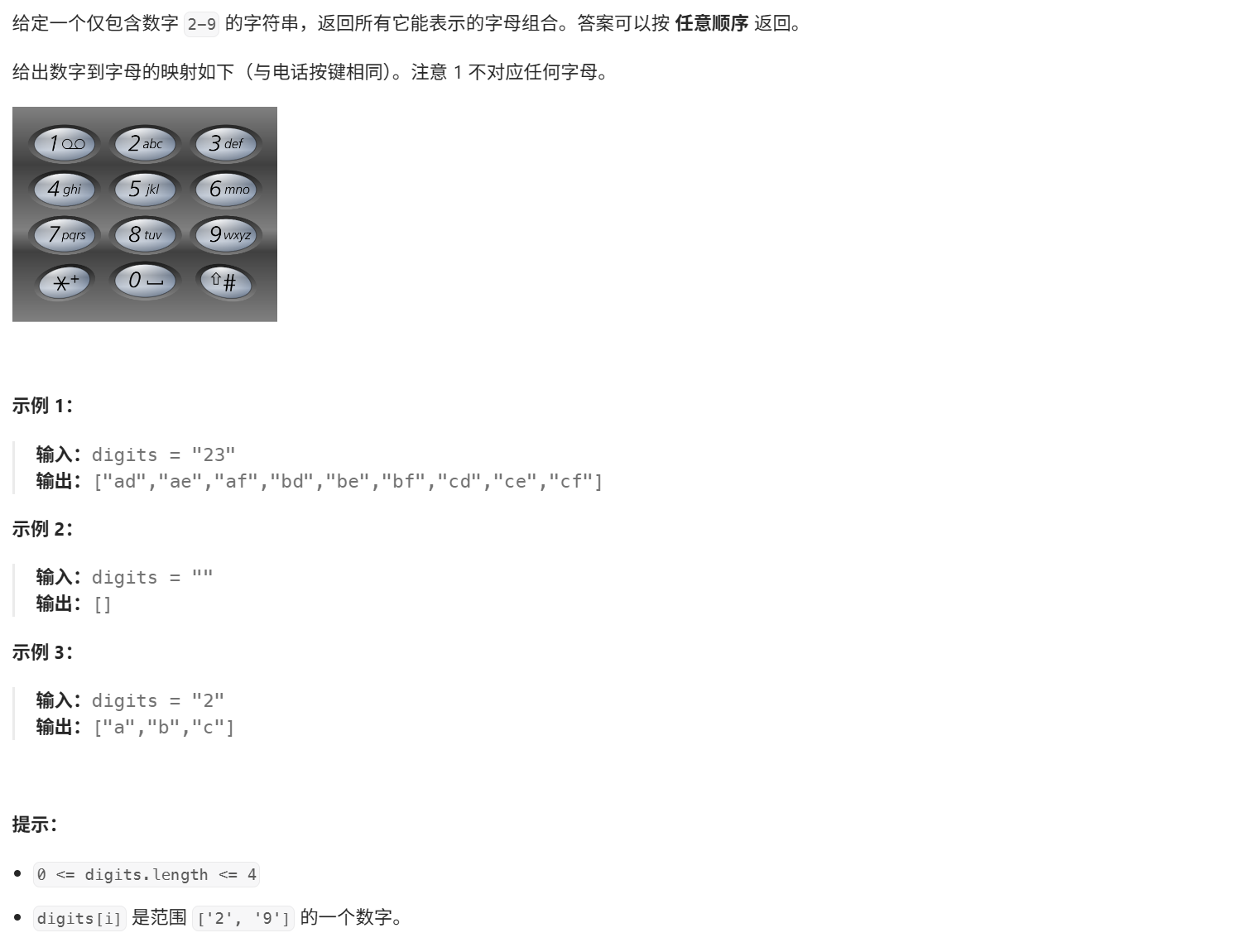 public:vector<string> letterCombinations(string digits) {if(digits.empty()) return ret;//填充hash表hash['2']="abc";hash['3']="def";hash['4']="ghi";hash['5']="jkl";hash['6']="mno";hash['7']="pqrs";hash['8']="tuv";hash['9']="wxyz";dfs(digits,0);return ret; }void dfs(string digits,int index){//递归出口if(path.size()==digits.size()){ret.push_back(path);return ;}char digit=digits[index];string str=hash[digit];for(int i=0;i!=str.size();i++){path.push_back(str[i]);//递归处理后面的层dfs(digits,index+1);//回溯path.pop_back();}}