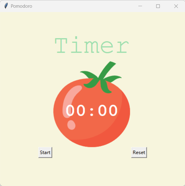 timer = Nonedef reset_timer():global reps, timerwindow.after_cancel(timer)canvas.itemconfig(timer_text, text="00:00")title_label.config(text="Timer", fg=GREEN)check_marks.config(text="")reps = 0timer = Nonedef start_timer():if timer is not None:returnglobal repsreps += 1work_sec = WORK_MIN * 60short_break_sec = SHORT_BREAK_MIN * 60long_break_sec = LONG_BREAK_MIN * 60if reps % 8 == 0: # 8th repcount_down(long_break_sec)title_label.config(text="Break", fg=RED)elif reps % 2 == 0: # 2nd/4th/6th repcount_down(short_break_sec)title_label.config(text="Break", fg=PINK)else: # 1st/3rd/5th/7th repcount_down(work_sec)title_label.config(text="Work", fg=GREEN)def count_down(count):count_min = count // 60count_sec = count % 60if count_sec < 10:count_sec = f"0{count_sec}"canvas.itemconfig(timer_text, text=f"{count_min}:{count_sec}")if count > 0:global timertimer = window.after(1000, count_down, count-1)else:timer = Nonestart_timer()# Add Checkmarksmarks = ["✔" for _ in range(reps // 2)]check_marks.config(text="".join(marks))# UI SETUP