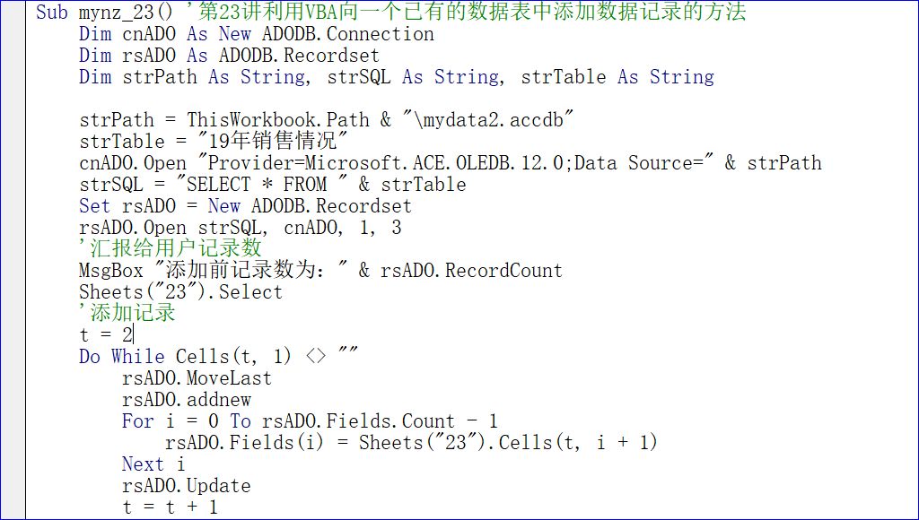 Sub mynz_23() '第23讲利用VBA向一个已有的数据表中添加数据记录的方法