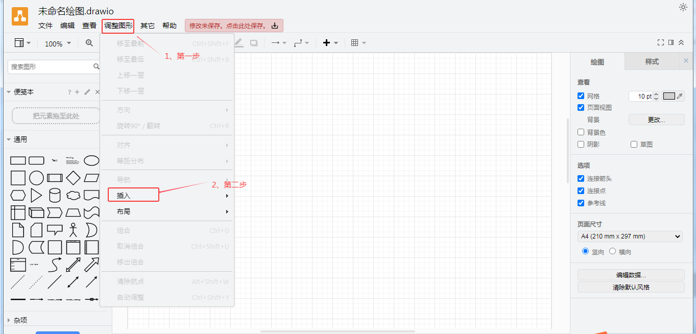 在Drawio的主界面中,点击“调整图形”菜单,在下面的界面中点击“插入”按钮。