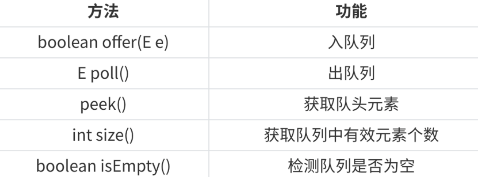 注意:Queue是个接⼝,在实例化时必须实例化LinkedList的对象,因为LinkedList实现了Queue接⼝。 package queue; import java.util.LinkedList; import java.util.Queue; public class Test { public static void main(String[] args) { Queue<Integer> queue = new LinkedList<>(); queue.offer(1); queue.offer(2); queue.offer(3); queue.offer(4); queue.offer(5); System.out.println("Queue: " + queue); System.out.println("Queuefist: " + queue.peek()); queue.poll(); System.out.println("Queue: " + queue); //判定队列是否为空 if(queue.peek()==null)} }