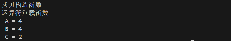 {Complex A(2.0);Complex B(4.0);Complex C = A; //拷贝构造函数A = B; //运算符重载函数std::cout << " A = " << A.real << std::endl;std::cout << " B = " << B.real << std::endl;std::cout << " C = " << C.real << std::endl;return 0;