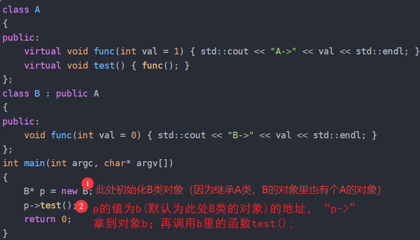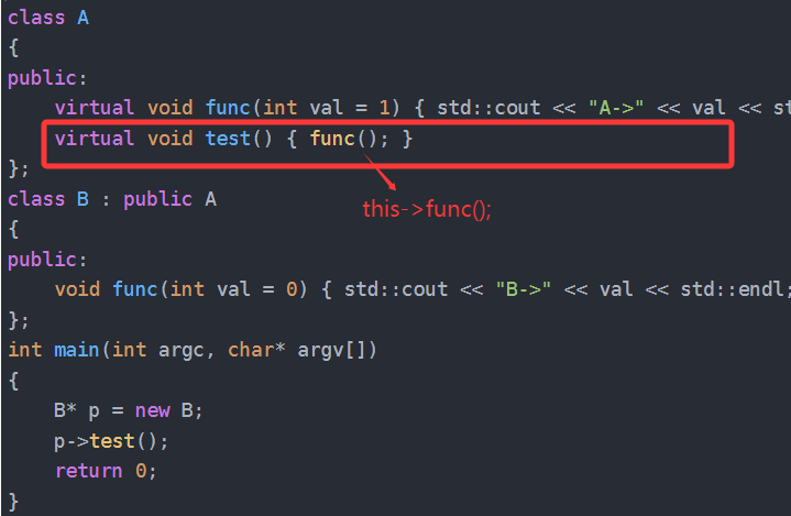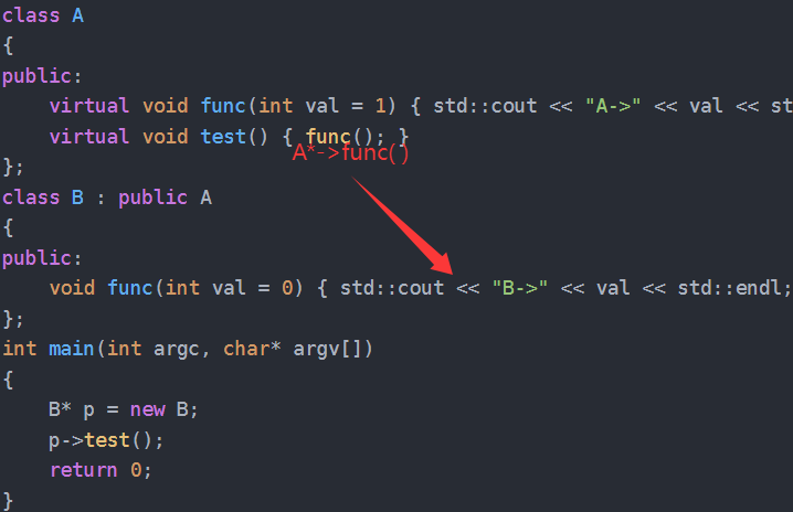 public:virtual void func(int val = 1) { std::cout << "A->" << val << std::endl; }virtual void test() { func(); }