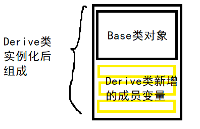 C++里,我们知道派生类初始化时,其对象首先会“安插”一个基类对象(安插:首先调用基类构造函数,完成基类对象初始化);然后接着完成本类新增成员变量的初始化,于是一个派生类对象长这样: