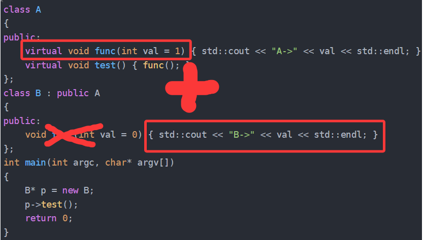 public:void func(int val = 0) { std::cout << "B->" << val << std::endl; }