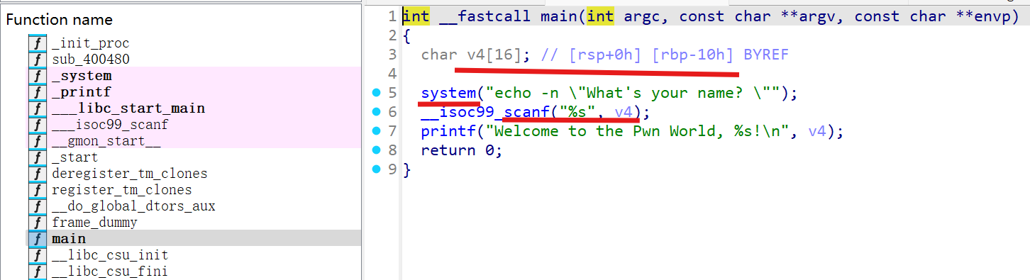 main函数中明显存在system函数的调用,并提示了输入v4的栈溢出风险,那么便可以尝试利用栈溢出漏洞配合ROP链的构造,直接调用system函数并传入命令进行解题。