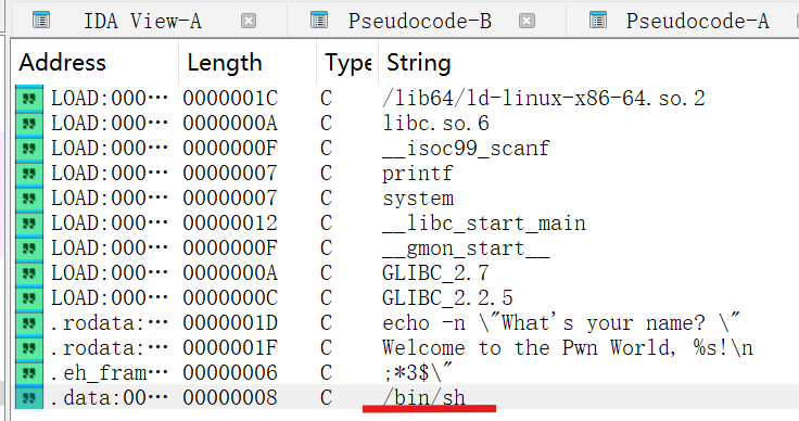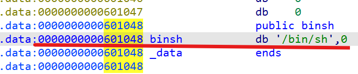 通过Shift + F12的先行搜索可以发现程序内含 /bin/sh 这一关键字符串的详细信息,双击跳转后可获得其地址:0x601048。