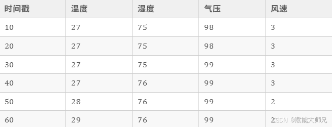 以嵌入式终端环境数据采集为例,以10秒间隔采样温度、湿度、气压、风速、四项环境数据,正常情况下,数据在短时间内都是小幅波动或者维持不变。假如采集结果如下表: