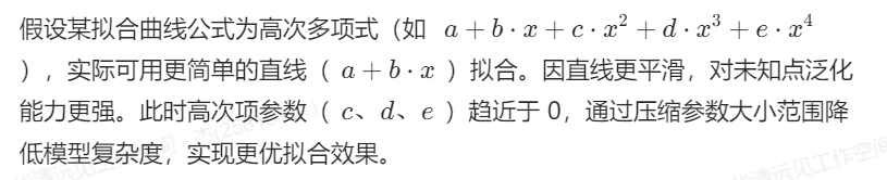 总结:,正则化通过 “惩罚大参数” 压缩模型表达能力,使其从 “记忆训练数据” 转向 “学习通用规律”,从而提升泛化性。