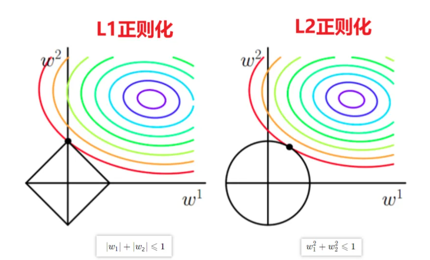 以包含两个参数 w1、w2 的模型为例,左图为 L1 正则化(约束区域为菱形),右图为 L2 正则化(约束区域为圆形),二者通过不同几何形状限制参数空间,实现复杂度惩罚。
