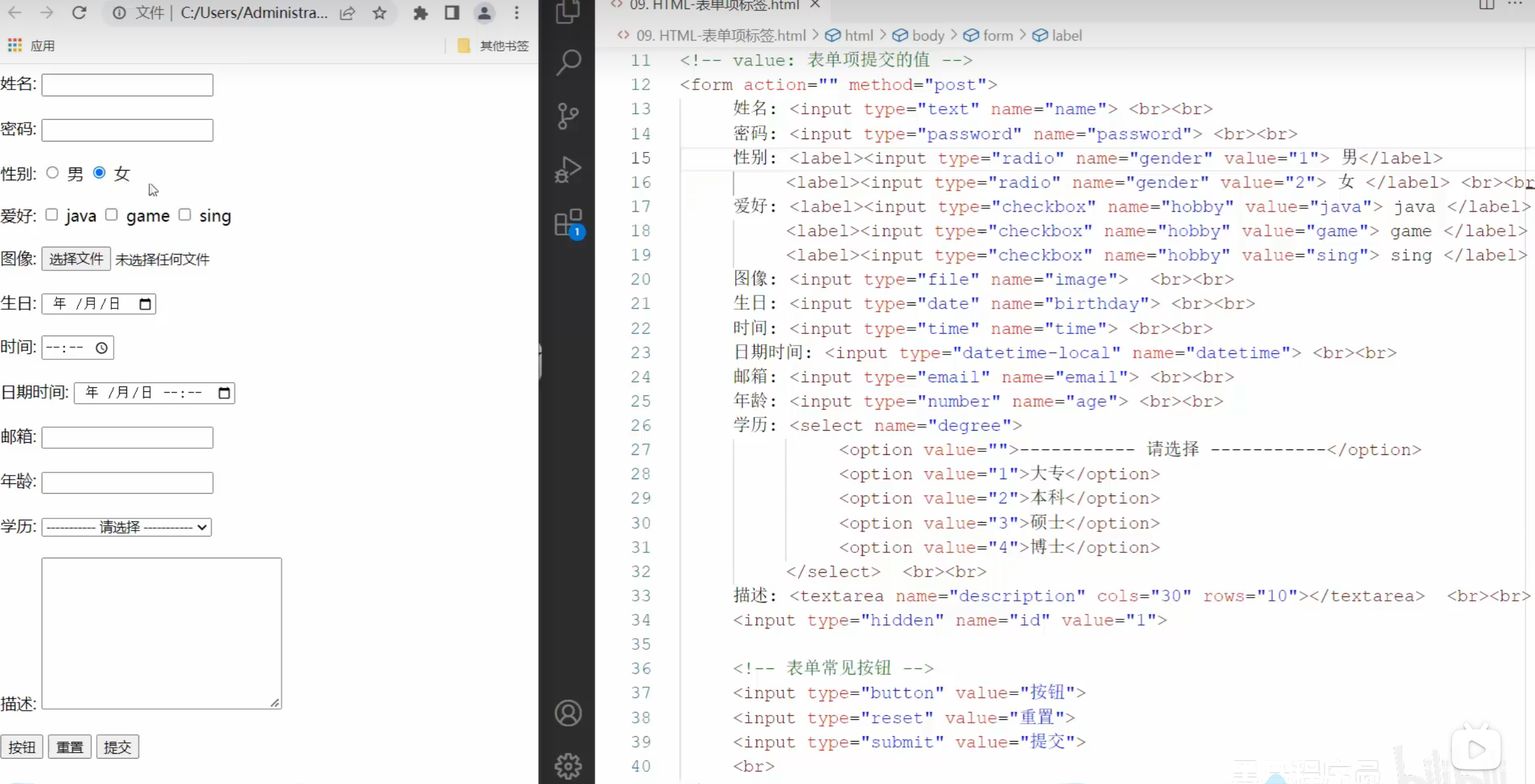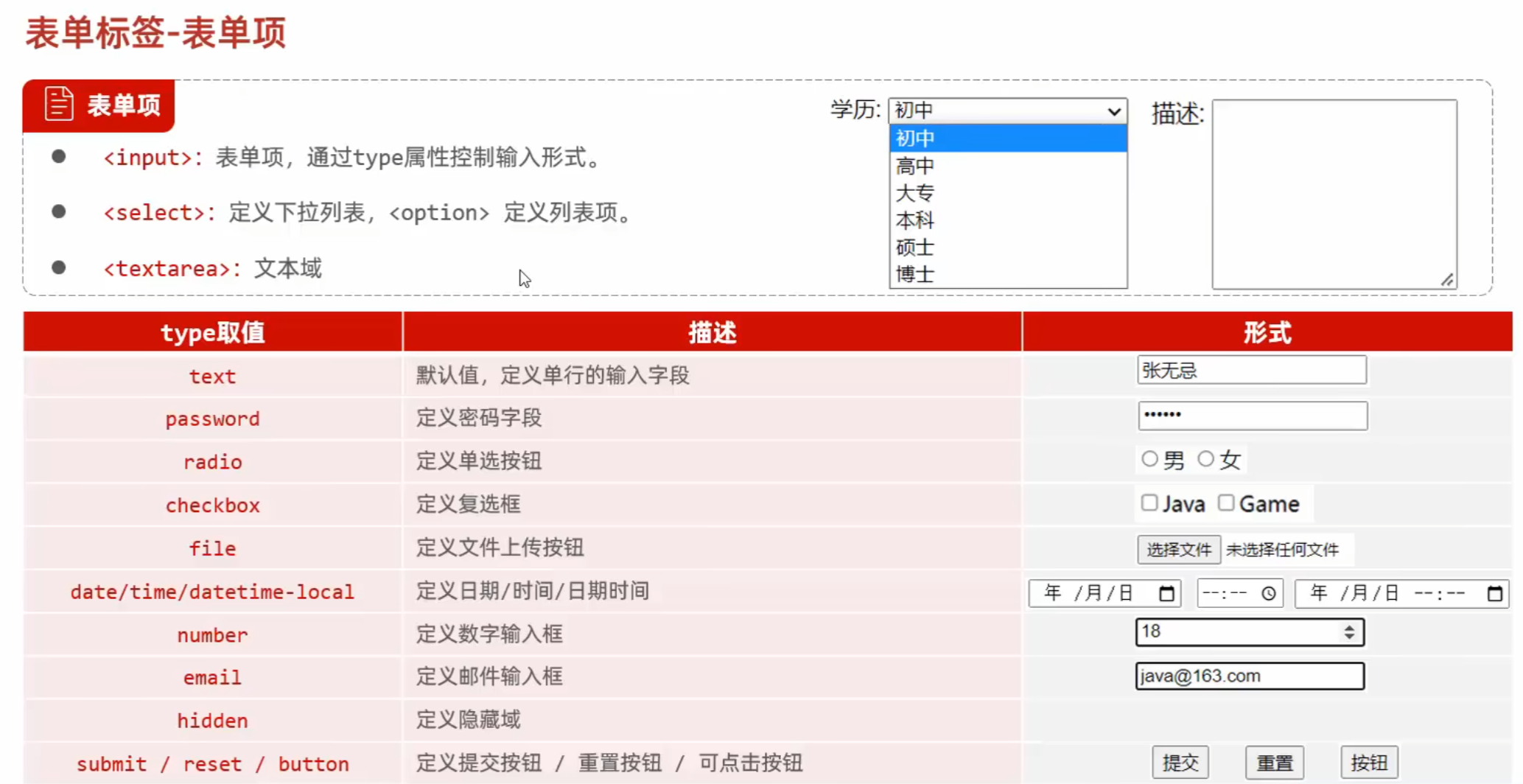 - 表单项:不同类型的input元素、下拉列表、文本域等等