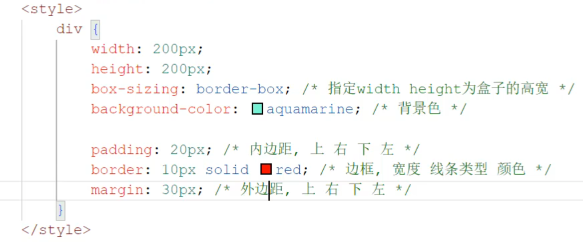 注:如果只是需要设置某一个方位的边框,内边距,外边距,可以在属性名后加上-位置,如:padding-top,padding-left....