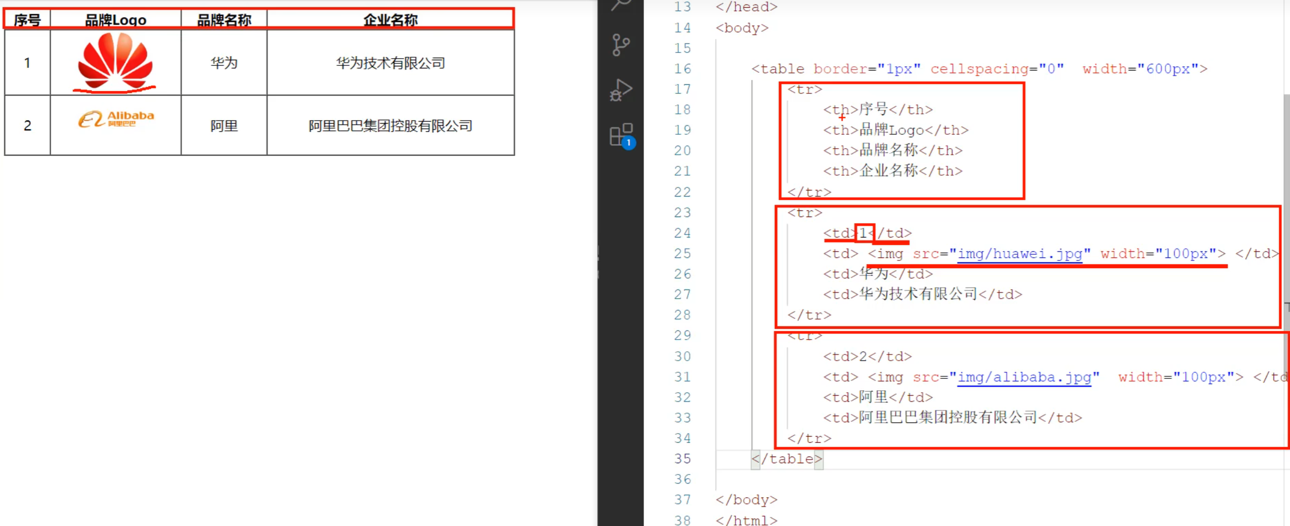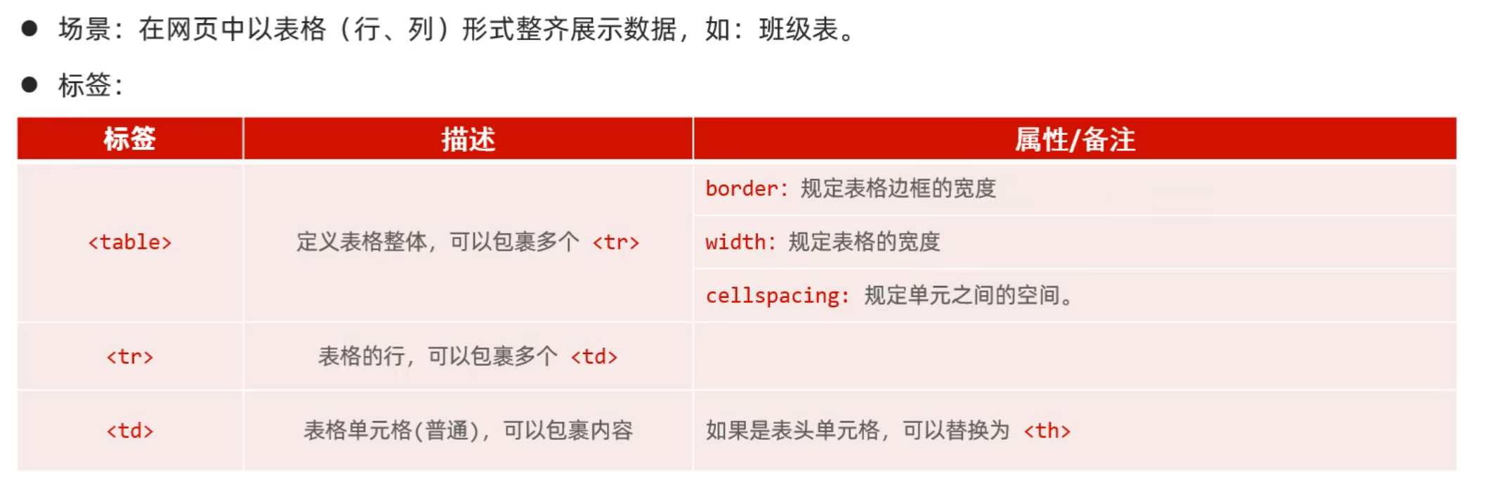 注:如果是表头单元格,用<th>拥有表头字体加粗及居中显示的效果;普通单元格用<td>即可