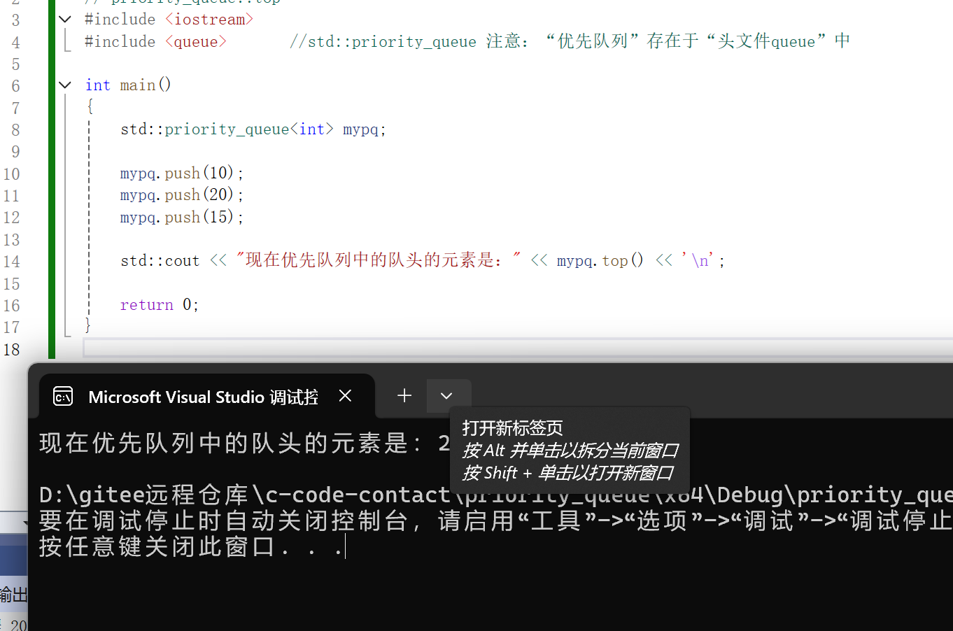 {std::priority_queue<int> mypq;mypq.push(10);mypq.push(20);mypq.push(15);std::cout << "现在优先队列中的队头的元素是:" << mypq.top() << '\n';return 0;