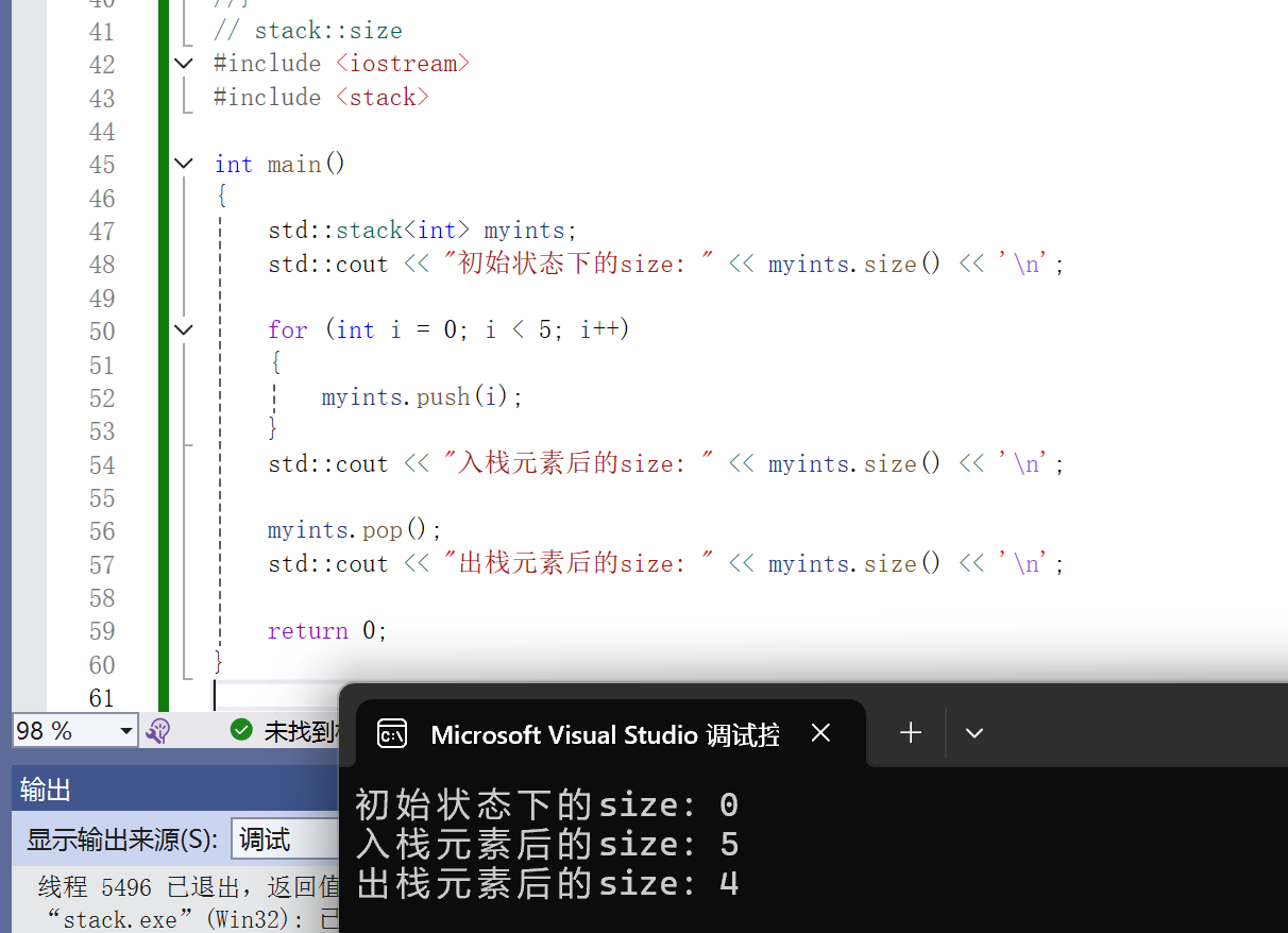{std::stack<int> myints;std::cout << "初始状态下的size: " << myints.size() << '\n';for (int i = 0; i < 5; i++){myints.push(i);}std::cout << "入栈元素后的size: " << myints.size() << '\n';myints.pop();std::cout << "出栈元素后的size: " << myints.size() << '\n';return 0;