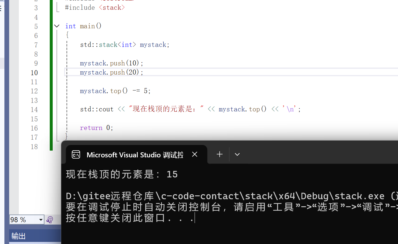 {std::stack<int> mystack;mystack.push(10);mystack.push(20);mystack.top() -= 5;std::cout << "现在栈顶的元素是:" << mystack.top() << '\n';return 0;