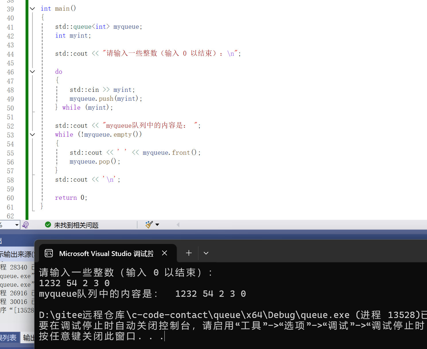 {std::queue<int> myqueue;int myint;std::cout << "请输入一些整数(输入 0 以结束):\n";do {std::cin >> myint;myqueue.push(myint);} while (myint);std::cout << "myqueue队列中的内容是: ";while (!myqueue.empty()){std::cout << ' ' << myqueue.front();myqueue.pop();}std::cout << '\n';return 0;