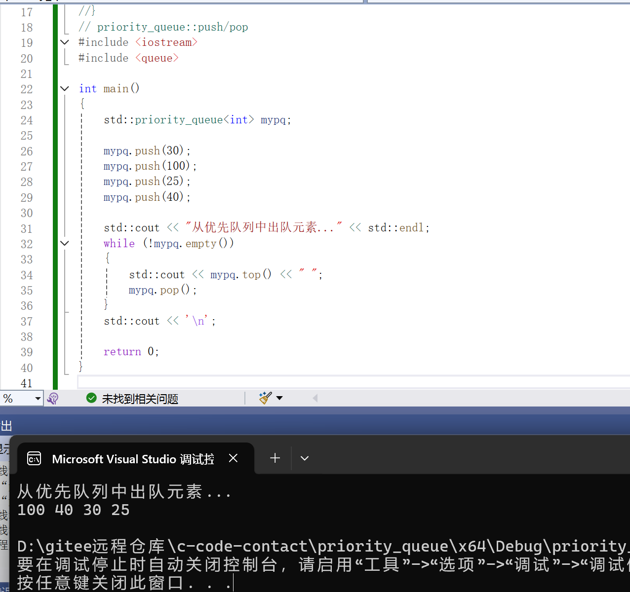 {std::priority_queue<int> mypq;mypq.push(30);mypq.push(100);mypq.push(25);mypq.push(40);std::cout << "从优先队列中出队元素..." << std::endl;while (!mypq.empty()){std::cout << mypq.top() << " ";mypq.pop();}std::cout << '\n';return 0;