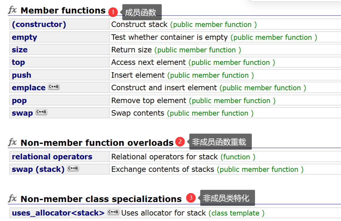 成员函数:stack自身定义的操作接口。