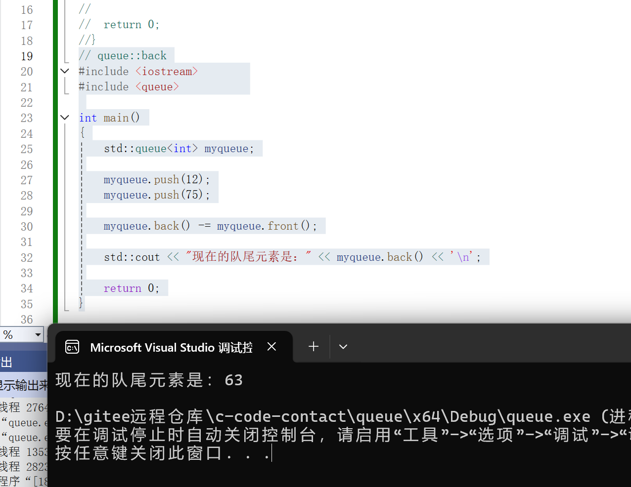 {std::queue<int> myqueue;myqueue.push(12);myqueue.push(75); myqueue.back() -= myqueue.front();std::cout << "现在的队尾元素是:" << myqueue.back() << '\n';return 0;