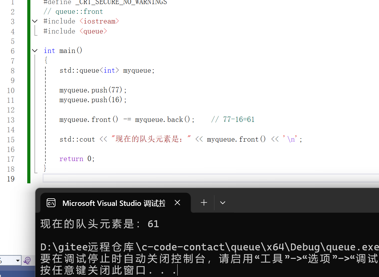 {std::queue<int> myqueue;myqueue.push(77);myqueue.push(16);myqueue.front() -= myqueue.back(); // 77-16=61std::cout << "现在的队头元素是:" << myqueue.front() << '\n';return 0;