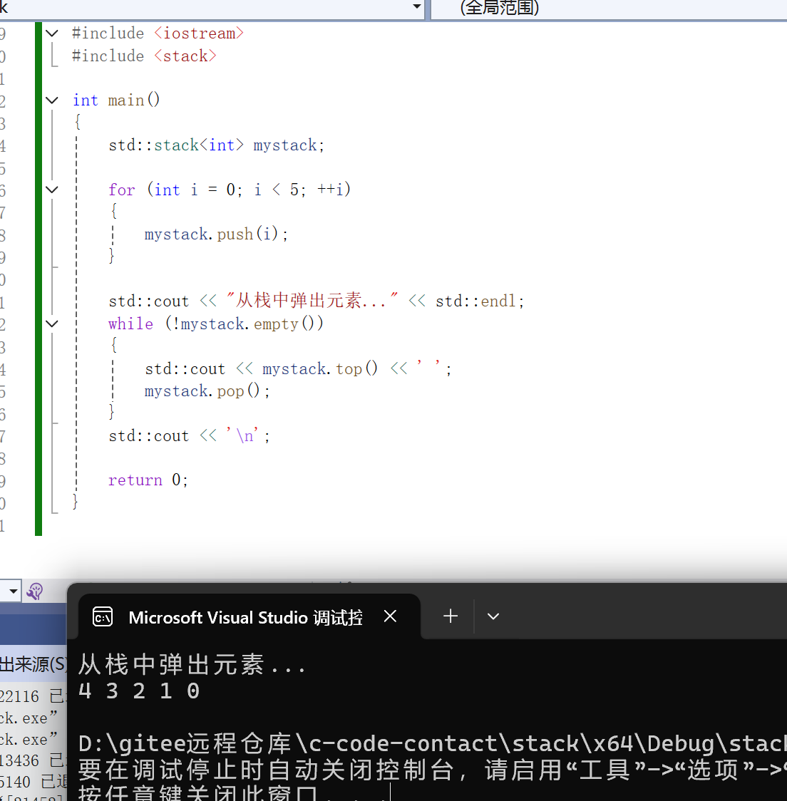 {std::stack<int> mystack;for (int i = 0; i < 5; ++i){mystack.push(i);}std::cout << "从栈中弹出元素..." << std::endl;while (!mystack.empty()){std::cout << mystack.top() << ' ';mystack.pop();}std::cout << '\n';return 0;