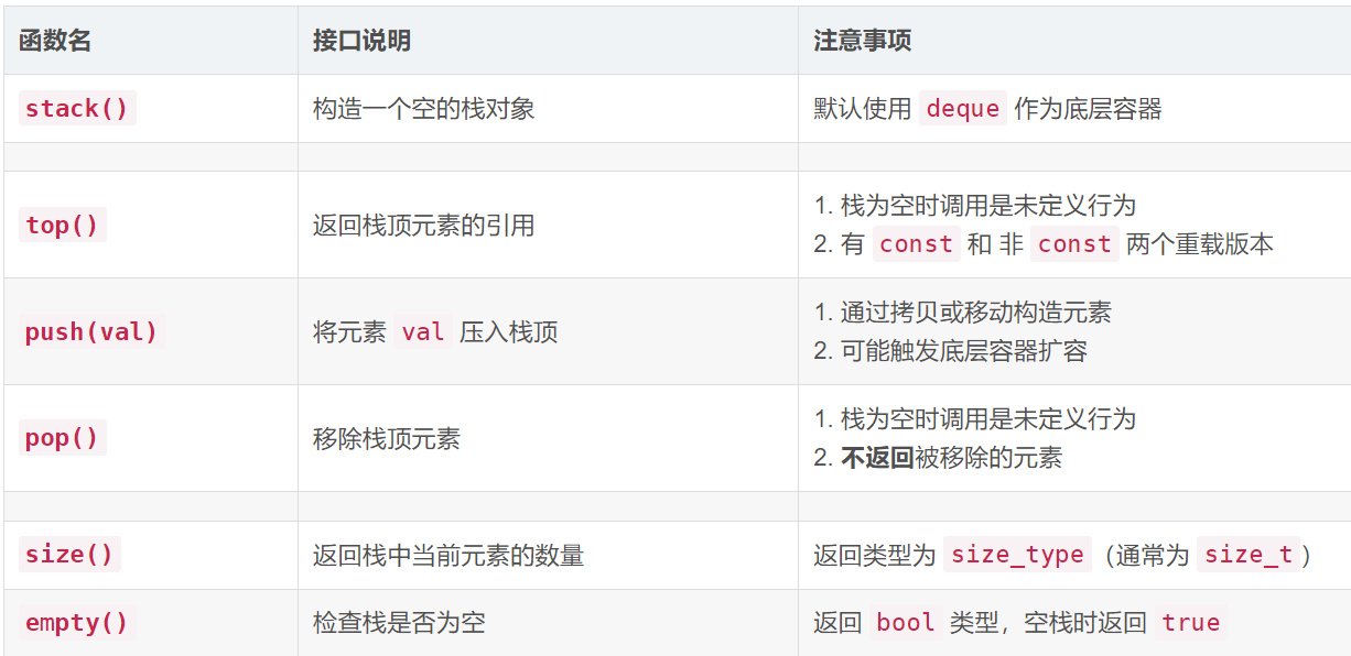 在C++STL容器中,为我们提供了 Stack 的接口函数,与 list、Vector、string类似,直接实例化使用即可,下面我们来学习 Stack 的常用接口: