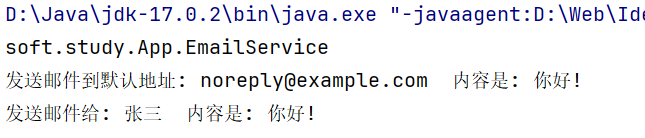 import java.lang.reflect.Method;public class MessageTools {public static void main(String[] args) throws Exception {// 模拟配置:通过类全限定名来决定加载哪个类String className = "soft.study.App.EmailService";// 1. 加载类Class<?> clazz = Class.forName(className);// 2. 创建对象Object service = clazz.getDeclaredConstructor().newInstance();// 3. 获取方法Method method = clazz.getMethod("send", String.class);Method method1 = clazz.getMethod("send", String.class, String.class);// 4. 动态调用方法method.invoke(service, "你好!");method1.invoke(service, "你好!", "张三");}