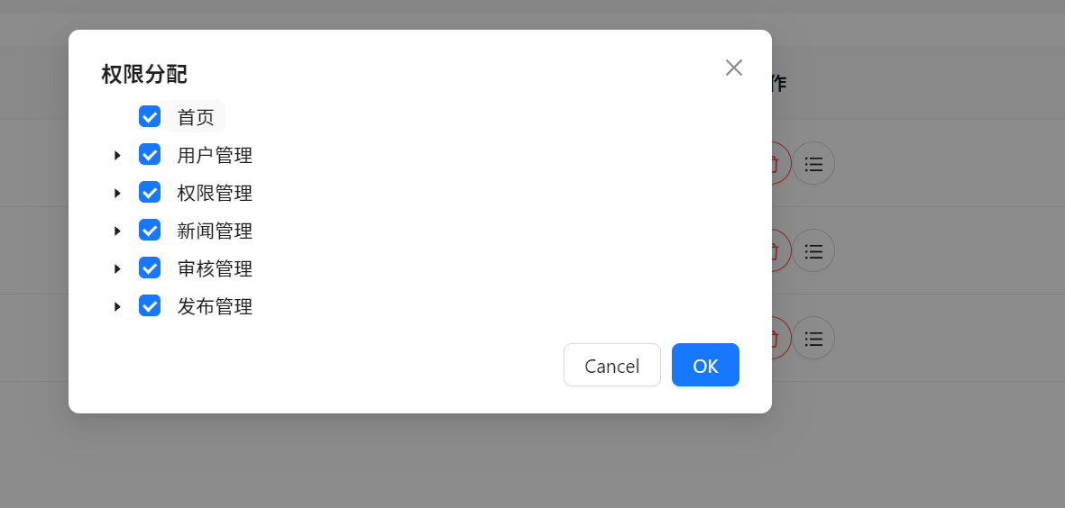 <div>{/*rowKey 如果数据中没有key这个属性,那就使用这个方法来赋值 表格行 key 的取值,可以是字符串或一个函数 */}<Table dataSource={dataSource} columns={columns} pagination={{pageSize:5}} rowKey={(item)=>item.id}/><ModalonOk={()=>handleOK(currentID)}onCancel={() => setIsModalOpen(false)}title="权限分配"open={isModalOpen}><Treecheckable// defaultCheckeys是一个非受控的组件 意思是这个组件只会显示默认选中的节点,不会受后续的修改 后续修改后也会不刷新组件//在antd中一般加上default属性都是非受控的checkedKeys={currentRight} //受控组件 但是表单里面的节点只能通过状态来控制onCheck={onCheck} //可以修改状态 来改变受控组件的结果treeData={rightList}// 可能是版本问题 如果不添加自定义属性 所有的数据都会被占位符代替 可能是因为我的数据和tree遍历的方法有冲突checkStrictly={true}// 不进行父子关联(父项勾选 子项全都被勾选) fieldNames={{title: 'label',key: 'key'}}/></Modal></div>